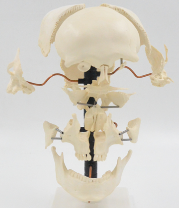 ■ 功能:模型顯示分解的22部件顱(lú)骨形態結構串製於鐵絲上,用於說明22部分顱骨(gǔ)的名稱;■ 材(cái)質:環保PVC材料,環保油漆(qī)