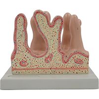 ■ 功能:模型顯示空腸內麵粘膜表麵許多絨毛結構(gòu),絨(róng)毛由粘膜(mó)上皮和固(gù)有(yǒu)層(céng)向腸腔突起而成;