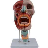 ■ 功能:該模型由頭頸部、喉腔正中矢狀切麵左、右側半,上、下(xià)兩部分,以及遊離的舌和咬肌、咽縮(suō)肌等10個部件組成,並顯示顱骨、鼻、口、咽、喉腔正中矢(shǐ)狀切麵、鼻中隔、麵(miàn)肌、咽肌、遊離舌(shé)等結構;
