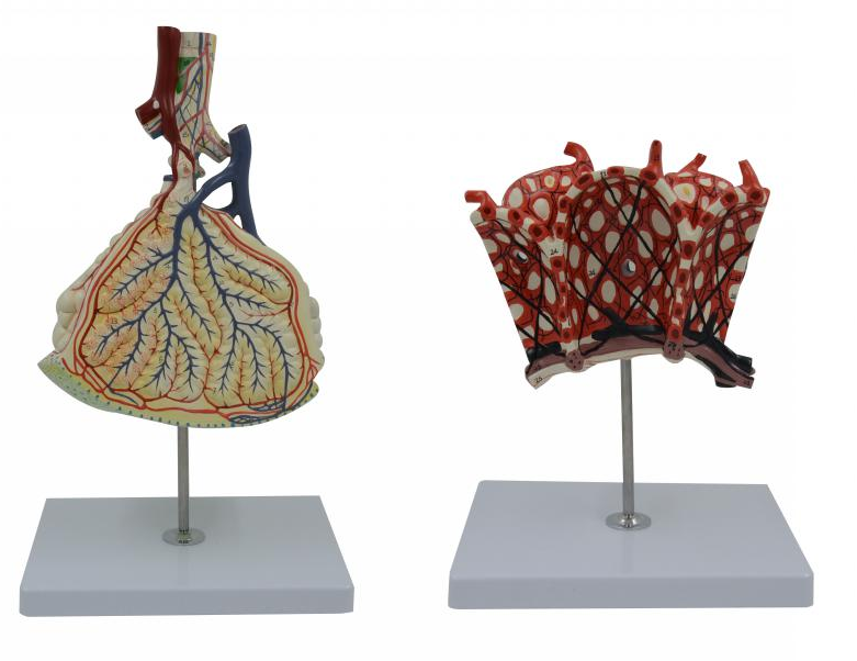 ■ 功能:模型由肺小葉放大模型(xíng)和肺泡放大模型兩個模型組(zǔ)成。肺小葉放大模型顯示終末細支氣管、呼吸性細支氣管、肺泡上皮等結構。肺泡放大模型顯示肺泡、肺泡上皮、肺泡囊(náng)、肺泡管、肺泡毛細血管等(děng)結構;