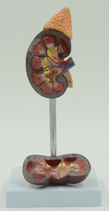 ■ 功(gōng)能:顯示腎上腺的腎的真人大(dà)小的模型。模型沿前平麵剖切,分為兩部分(fèn)顯示(shì)內部結構,包括皮質、髓質、帶乳頭的錐體、部分開放的腎盂、輸尿管、血管;