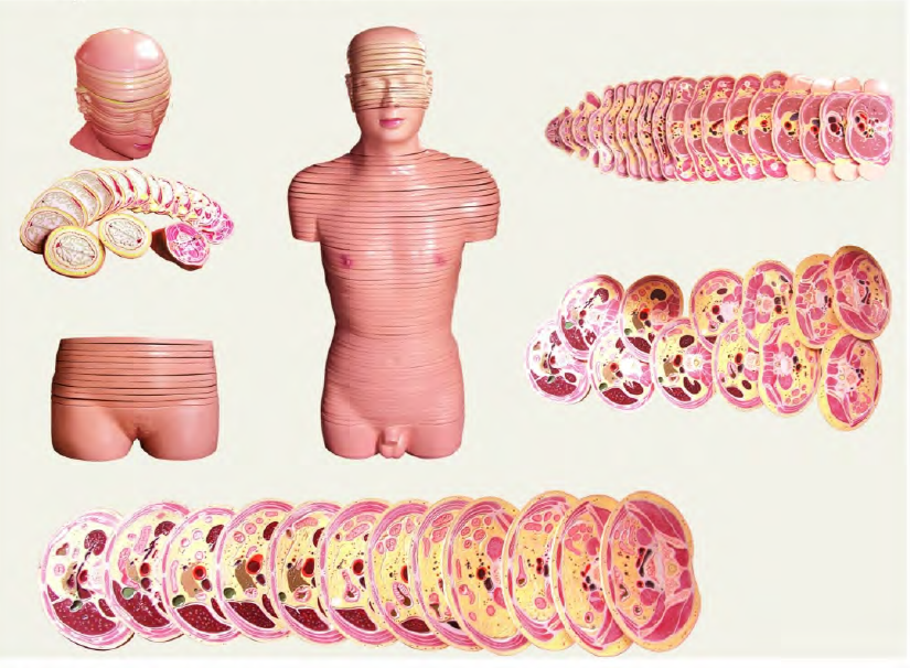 ■ 功能:顯示人體男女性水平斷麵解(jiě)剖模型結構和形態,將人體從頭頸部到盆部整個軀幹分解成93片典型部分的結構,由頭頂部至坐骨結節作厚約10mm橫切片,男女盆腔部(bù)可互換;