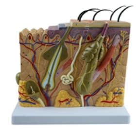 功能:模(mó)型是放(fàng)大70倍(bèi)的皮膚立體模型,顯(xiǎn)示了各(gè)層皮膚以(yǐ)及其附屬器