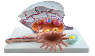 功能:模型展示了人類輸(shū)卵管和卵巢(cháo)的(de)解剖結構。卵泡顯示在不同(tóng)的(de)成熟階段。從初級卵泡到白念珠菌體。初級卵泡(pào)是橫截麵,以說明內部結構,卵母細胞,透明帶和顆粒細胞;