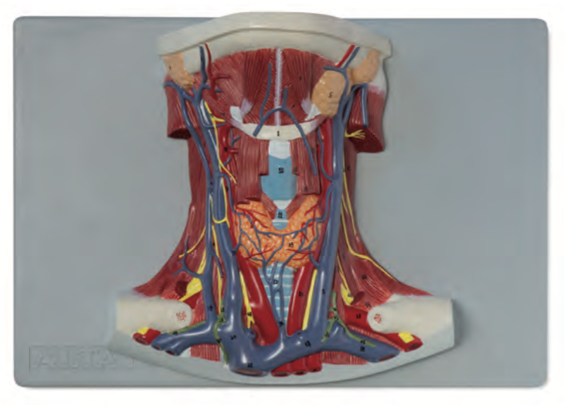 ■ 功能:產品上至下頜骨下至胸骨(gǔ)柄(bǐng),示頸前部的淺層結構(gòu)。產品剝離淺筋(jīn)膜示部分舌骨上下肌群、甲狀腺、上腔靜脈在(zài)頸部(bù)的屬支,頸總動脈在(zài)頸部的分支。上腔靜脈在頸部的屬支有:頭臂幹頸內靜脈,甲脈腺上(shàng)中下靜(jìng)脈、頸外淺靜脈等(děng)。模型上頸總動(dòng)脈在頸(jǐng)部的分支有:甲狀腺上、下(xià)動脈, 頸內外動(dòng)脈、甲狀腺(xiàn)最下動脈等(děng),同時還示頸部的淺部神經;