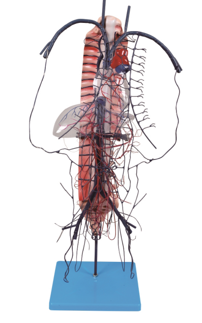 ■ 功能:顯示門靜脈的合成,屬(shǔ)支及門(mén)靜脈吻合情況,模型上可見到門靜脈是由腸係膜上靜脈和(hé)脾(pí)靜脈合成,經肝門(mén)入肝, 在肝內反複分支成毛細血管,然後再匯集成三支肝靜脈經第二肝門出肝,在腔靜脈窩內注入(rù)下腔靜脈。模(mó)型上的門(mén)靜脈(mò)屬支尚有胃冠(guàn)狀靜脈、胃右靜脈、附臍(qí)靜脈以及注入脾靜脈的腸係膜下靜脈等。此外,在盆腔內可見到直腸(cháng)靜脈叢及直腸上、下靜脈;在胸腔(qiāng)內可見食(shí)管靜脈叢及奇靜脈和半奇靜脈;在胸腹壁上可見到臍旁靜脈叢及胸腹壁(bì)上、下靜脈、腹壁淺靜脈和胸腹壁(bì)靜(jìng)脈;