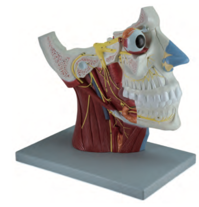 功能:模(mó)型上帶部(bù)分顱底。眶的上壁和外側(cè)壁已剖掉,暴露出(chū)眼球,眼球外肌和眶內神經,下頜支及部(bù)分顳骨(gǔ)、頸部淺層(céng)肌除去、暴露出腦神經在頸部的分布。顱底內(nèi)麵可見(jiàn)十二對腦神(shén)經出入顱底孔裂的情況,在(zài)正中麵(miàn)上,上(shàng)鼻甲(jiǎ)粘膜內(nèi)可見嗅神經絲穿篩孔進入嗅球,切開鼻腔(qiāng)外側壁(bì)暴(bào)露(lù)翼齶(è)神經節及其分支。眶(kuàng)內顯示(shì)眼球、眼球外肌, 動眼神經,滑車神經,展神經,三叉神經眼支和睫狀神經節(jiē)的位置的分布。下頜支及顳骨一部已切去(qù),顯露三叉神經的上頜神經(jīng),下(xià)頜神經的走行、分支、分布和下頜下神經節。麵神經(jīng)在麵神經管內分出岩大淺神經和鼓索的情況,舌咽神經、迷走神經在頸部走行、分布情況,副(fù)神經支配胸鎖乳突肌和斜(xié)方(fāng)肌,舌(shé)下神經進(jìn)入舌內等情況