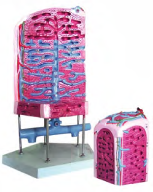 ■ 功能(néng):模型是將人(rén)肝的一個(gè)肝小葉放大(dà),屬五角(jiǎo)棱柱形,在肝小葉周邊可見到(dào)小葉間結蒂組織,內(nèi)有小葉間動(dòng)靜脈、膽管(guǎn)及淋巴管,並可看到小葉表(biǎo)麵的肝板及血竇。並可將模型解剖開,顯示其(qí)內部的中(zhōng)心靜脈、肝血(xuè)竇、肝板、每個肝細胞的立體外形、肝細(xì)胞表(biǎo)麵的毛細膽管(guǎn)及肝血竇中枯否化細胞。模型上附有二塊特殊部分,一個是透(tòu)明部分,可透視出肝血竇,以及環繞每個(gè)肝細胞的六角(jiǎo)形(xíng)毛細膽管立體網,用於顯示肝細胞,肝血竇及毛細膽(dǎn)管三者間(jiān)的複雜關(guān)係。另(lìng)一個是顯示肝小(xiǎo)葉外麵(miàn)到中間部的肝小葉(yè)部分結構,其中肝血(xuè)竇大部為橫斷,其間的肝細胞基本上為一層。在本肝小葉模型下麵附有小葉(yè)下靜脈;