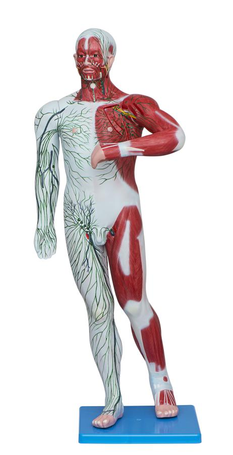 ■ 功能:模型右半顯示淺層結構:頸外淺靜脈及(jí)其屬支(zhī),上肢頭靜脈,貴(guì)要靜脈和前臂正中靜脈,下肢(zhī)大小隱靜脈及其主要屬支(zhī)。頸淺淋巴結、肘淋巴結、腹股溝下淺淋巴結的分布位置及它們的收集範圍;左半側主要顯示頸深淋巴(bā)結和腋(yè)淋巴結的配布以及它們(men)各收集的範圍,背部淺層肌及淋巴管也有所顯示;