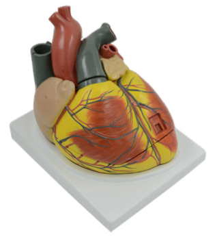 ■ 功能:模型外形部分(fèn),示冠狀溝,溝的上方為(wéi)心底部,包括心房、心耳及出入心髒的大血管。示前、後(hòu)室間溝(gōu)為左右(yòu)心室的分界。出人心髒的大血管有上、下腔靜脈,肺靜脈、肺動(dòng)脈、主動脈及主動脈弓上發出的三條血管(guǎn)。(由右向左為頭臂(bì)幹, 右頸總動脈、左鎖(suǒ)骨下動脈),營養心髒的血管(guǎn)有左、右冠狀動脈。示(shì)心小靜脈,心中靜脈,心大靜脈,及冠狀竇。內部(bù)構造:主要顯示四個心腔;此外,左右心房之間有房(fáng)間隔,上有卵園窩,左(zuǒ)右心室(shì)之間有室(shì)間隔(gé),在隔上示膜部和肌(jī)性部;
