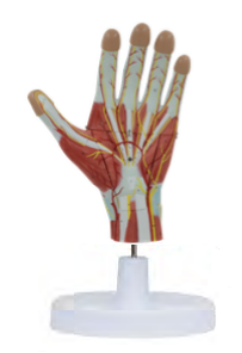 ■ 功能:模型在掌部(bù)做(zuò)有橫切,示掌淺、深弓及肌腱、腱鞘、手部肌肉(ròu)等,附掌部血管神經。手背(bèi)側示(shì)腕背側韌帶,指總伸肌腱鞘,撓側腕長(zhǎng),短伸肌腱鞘,拇長伸肌腱鞘,小指固有伸(shēn)肌腱鞘;切斷手背側總伸肌腱鞘,以暴露骨間(jiān)背側肌;手掌側第一層示腕掌側韌(rèn)帶手腕橫韌帶;第二層切斷拇短屈肌(jī)腱,拇短展肌(jī)及小指展肌,小(xiǎo)指(zhǐ)短屈肌以示拇(mǔ)指對掌肌及小指對掌肌、尺側囊,指淺屈(qū)肌腱,蚓狀肌,大魚際,小魚際;第三層切斷指淺屈肌腱,示指深屈肌腱;第四層顯示拇(mǔ)收肌,骨間肌等內容(róng);