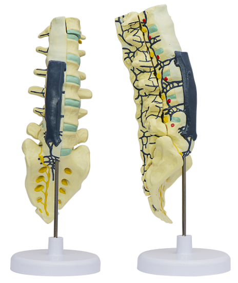 ■ 功(gōng)能:顯示脊柱的腰屈和(hé)骶屈,剖開一胸椎,示骨髓腔、骨鬆質、骨密(mì)質和椎間盤(pán)。在腰骶椎的背側,顯示馬尾、終絲,同時還顯示部分腰神經,骶神經穿(chuān)椎間孔和骶(dǐ)前(qián)、後孔的情況及該部位的靜脈回流(liú)。顯示腰(yāo)椎、骶尾椎的解剖特征和與該段脊神經的位置關係;